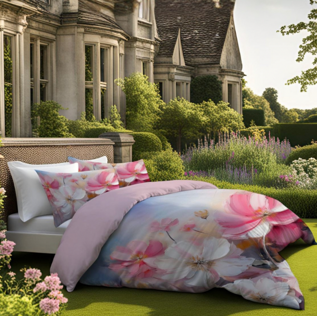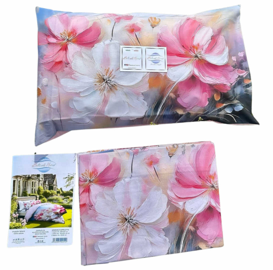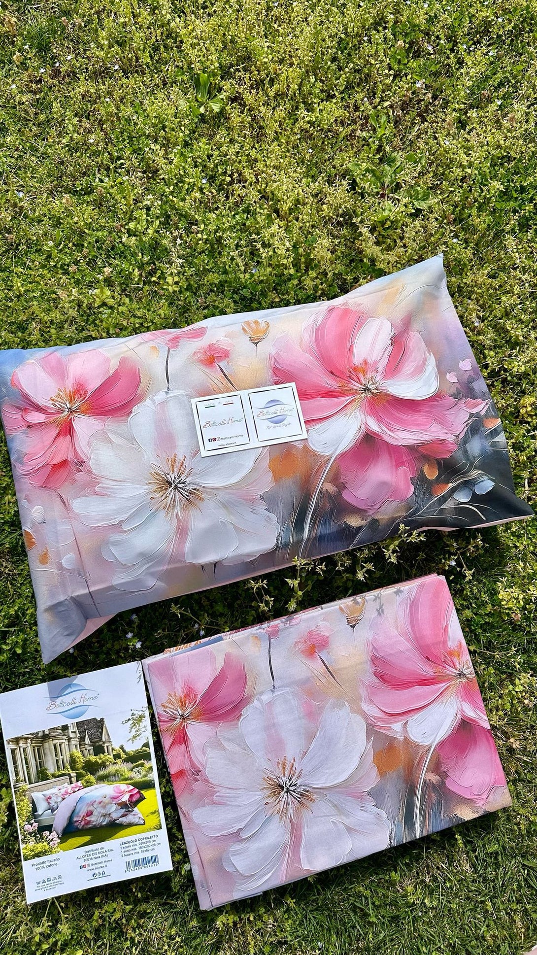 Petali di Luce è il completo lenzuola firmato Botticelli Home che incanta al primo sguardo: una stampa digitale ad alta definizione che riproduce grandi fiori dipinti a mano, in delicate sfumature di rosa e bianco, come un quadro che sboccia direttamente sul letto.