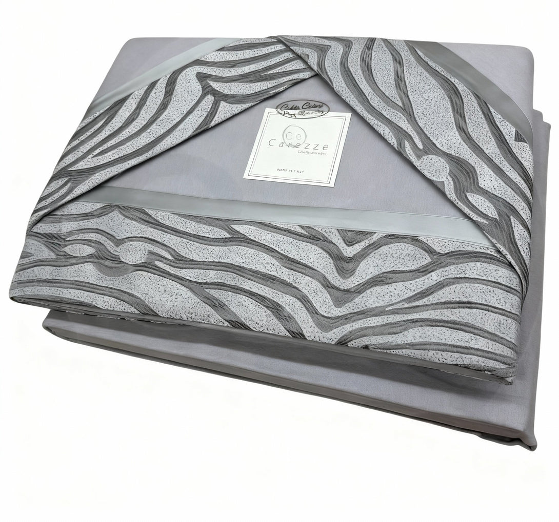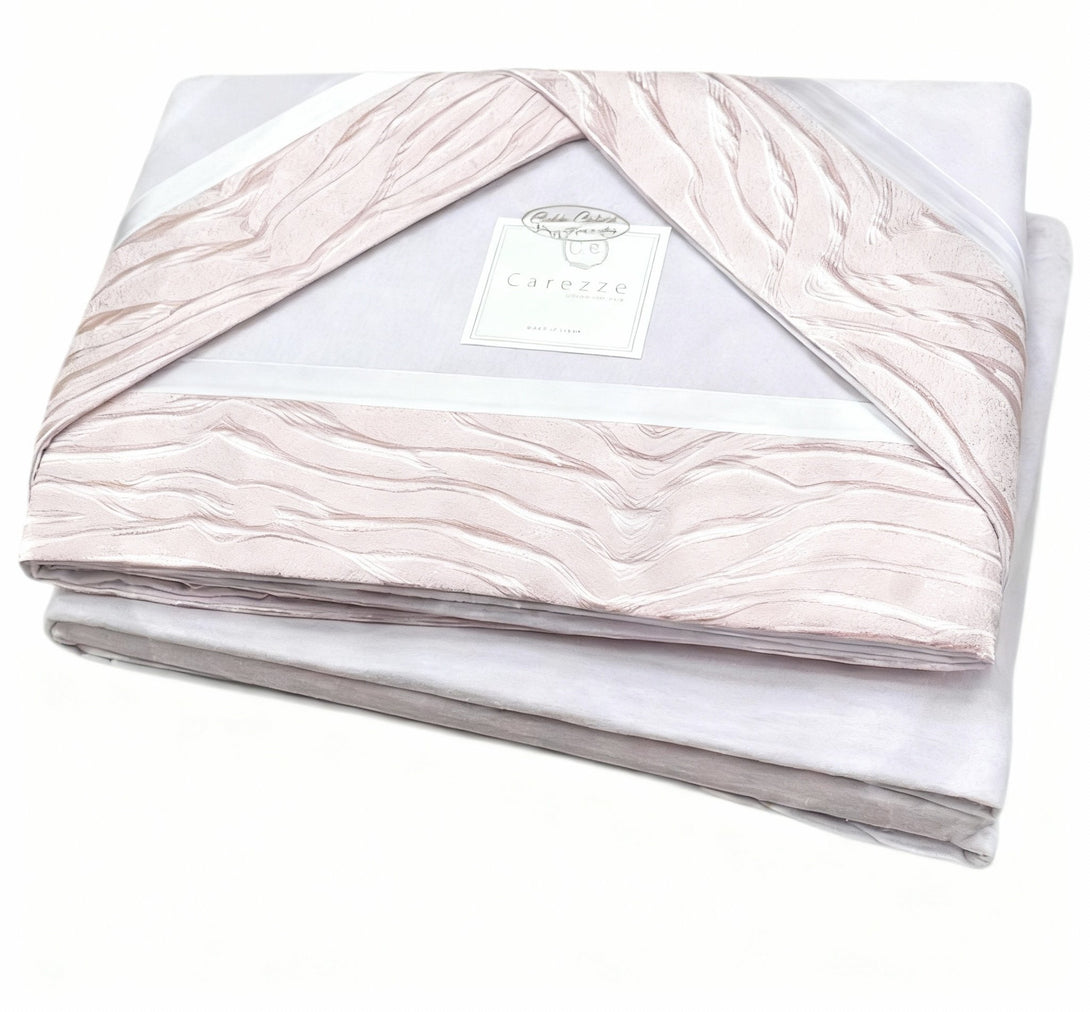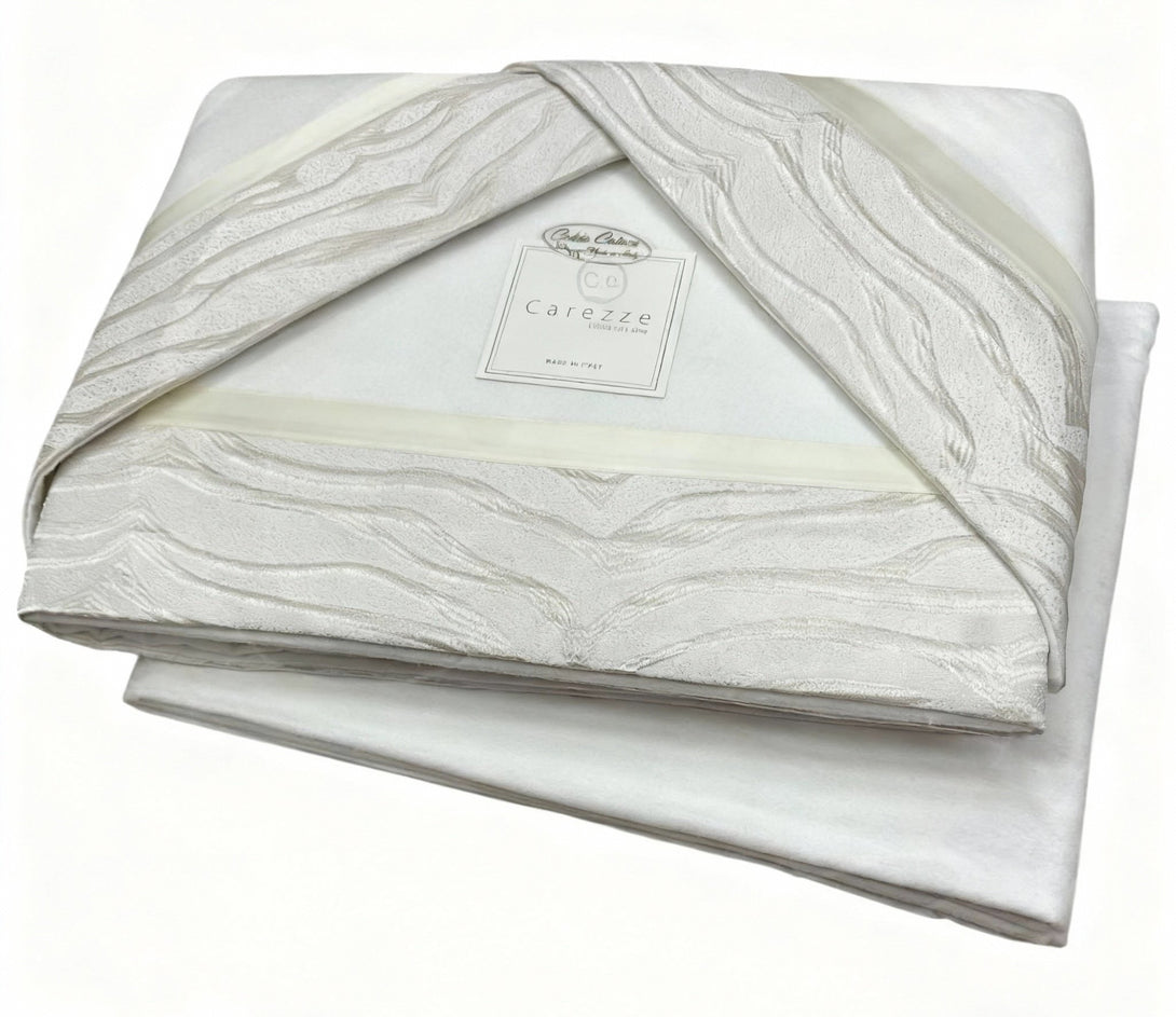 Il Completo Lenzuola Josephie unisce la purezza della tinta unita alla raffinatezza di una fascia in raso jacquard, un dettaglio elegante e ricercato che impreziosisce il letto con un tocco di stile contemporaneo e sofisticato.