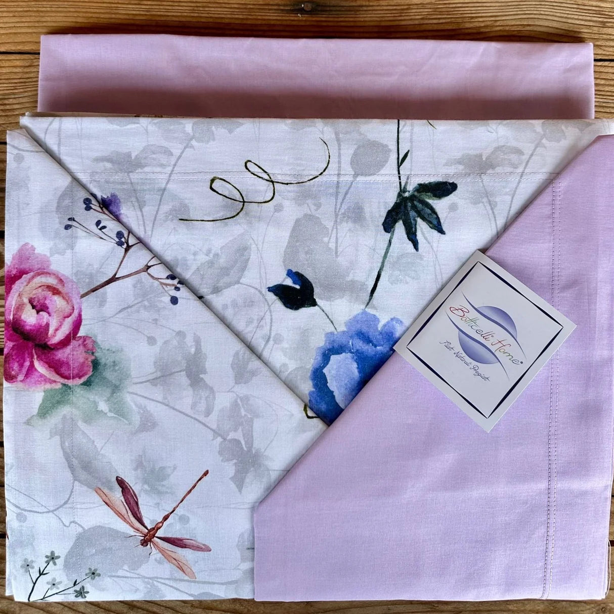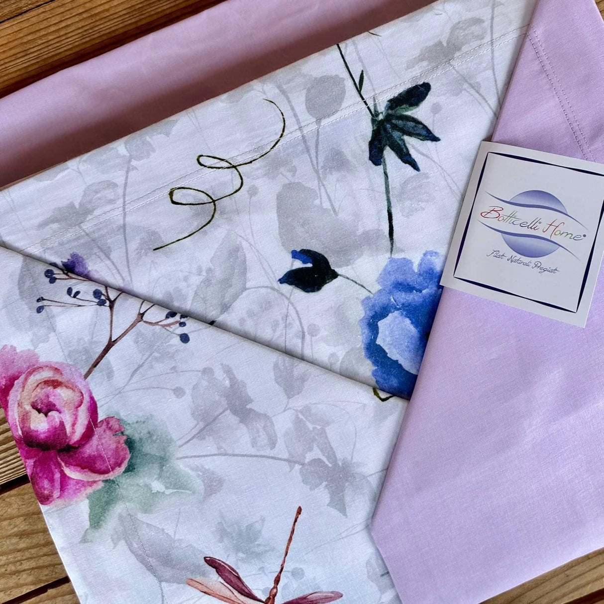 La fantasia floreale in stile acquerello si posa su uno sfondo leggero e vellutato, mentre le federe abbinate e il lenzuolo sotto in tinta unita aggiungono contrasto e armonia visiva. Morbido, traspirante e resistente ai lavaggi, è perfetto per accompagnarti con eleganza in ogni stagione.