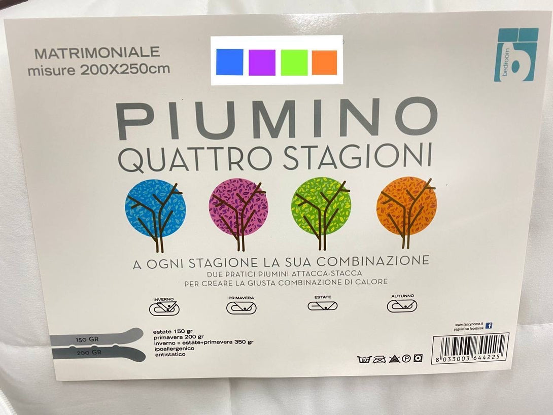 Morbidezza e comfort sono le caratteristiche fondamentali del piumino quattro stagioni. E' costituito da due piumini più leggeri che, uniti insieme tramite i pratici bottoni a pressione, ne formano uno perfetto per la stagione più fredda, rendendolo ideale per tutto l'anno.