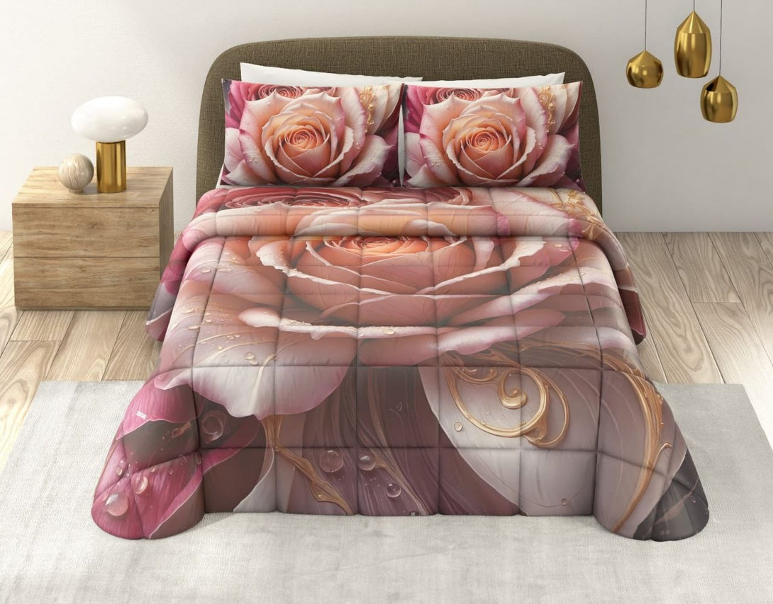 Un’esplosione di fiori in tonalità calde e avvolgenti: la trapunta Lynn porta in camera da letto l’eleganza di un giardino in fiore. Le maxi rose, sembrano sbocciare direttamente sul tessuto, creando un effetto scenografico e raffinato.