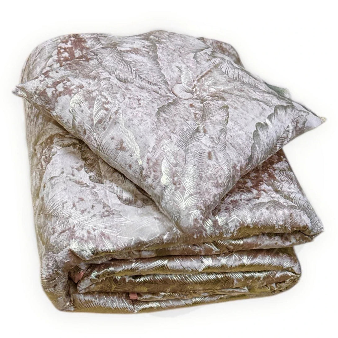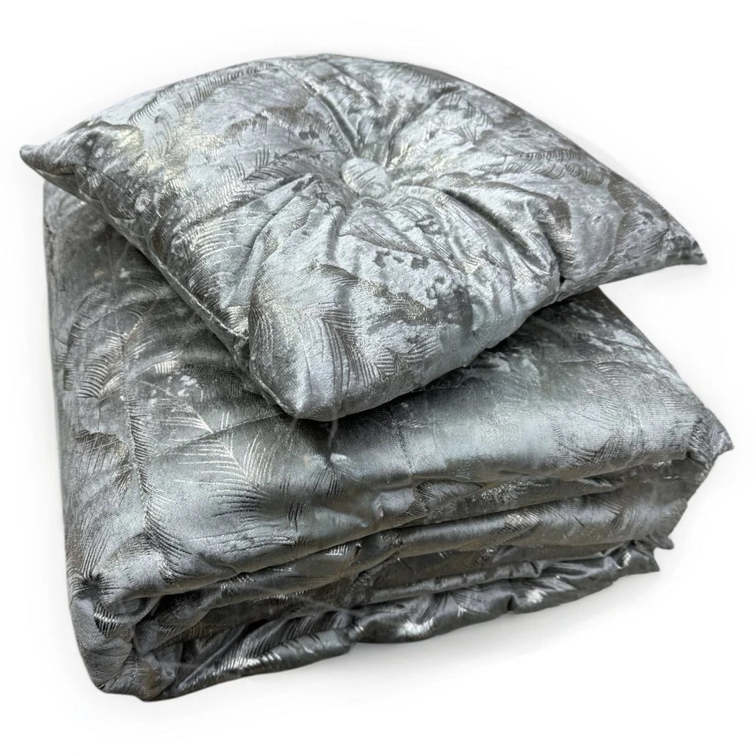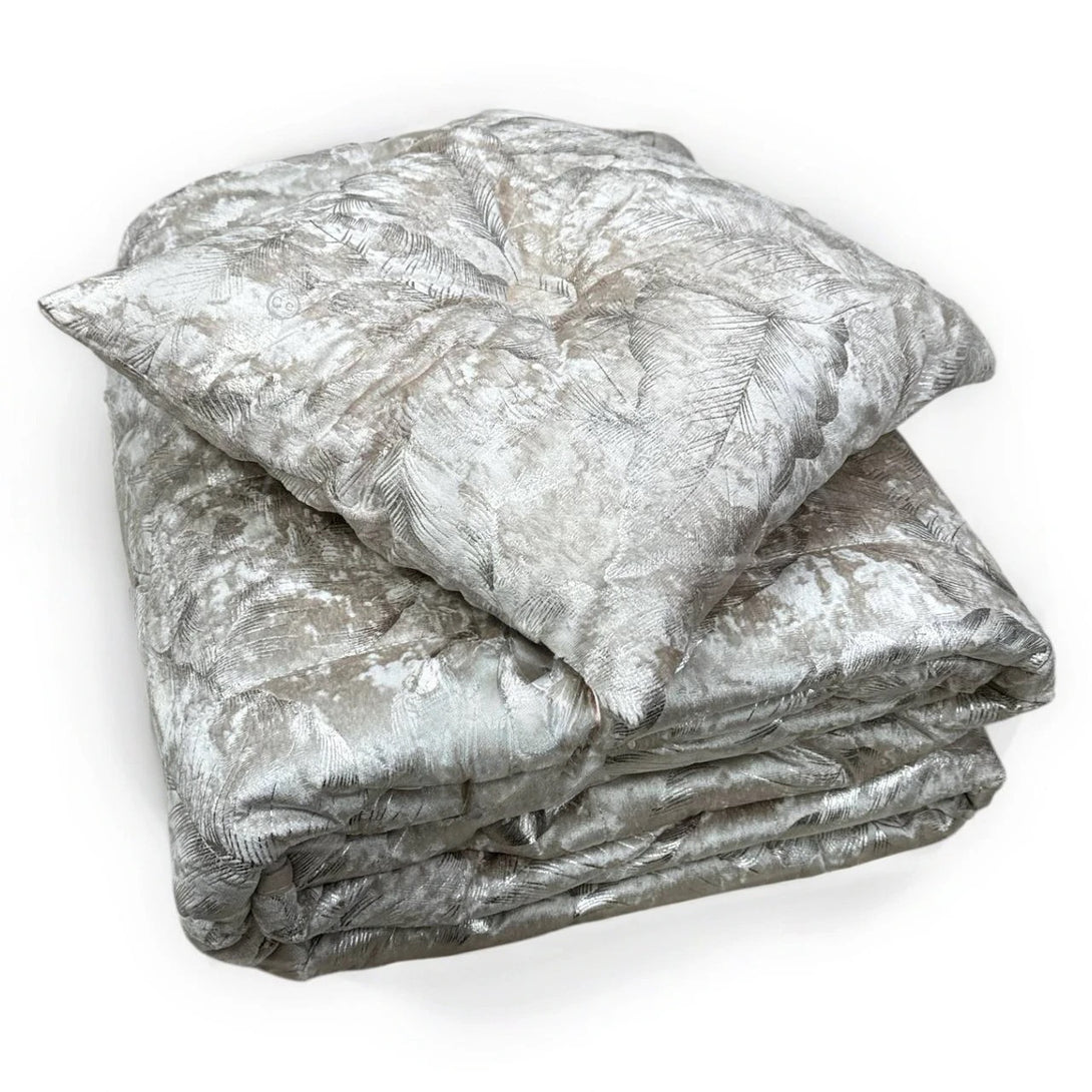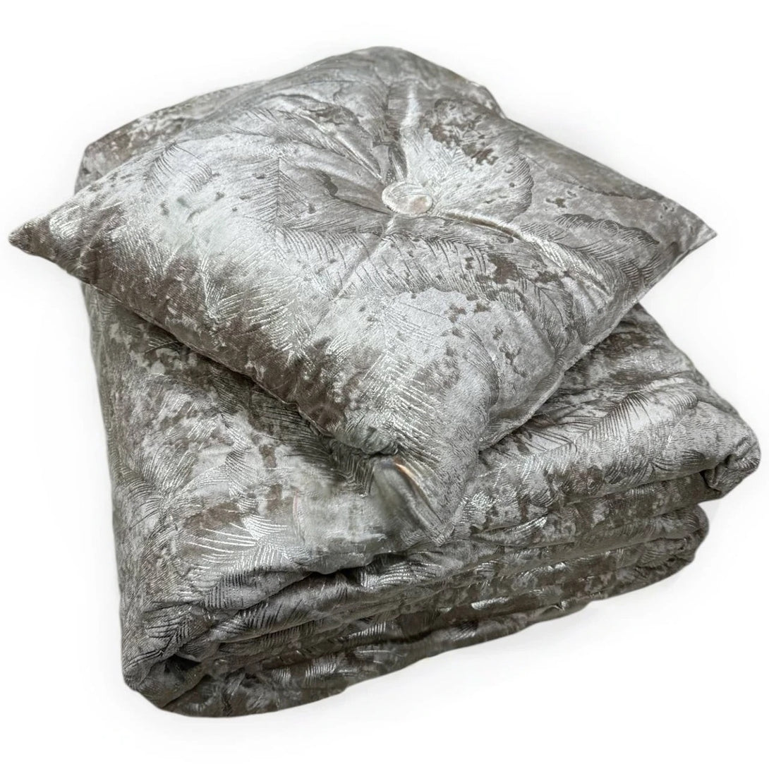 La trapuntatura dona profondità e struttura al tessuto, mentre l’imbottitura da 130 gr/mq lo rende perfetto per le mezze stagioni, offrendo il giusto equilibrio tra comfort e leggerezza. Completa il set un cuscino arredo coordinato, per un look armonioso e curato nei dettagli.