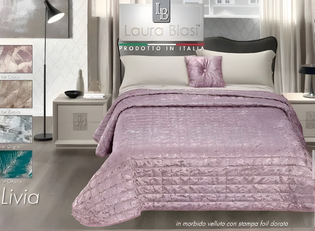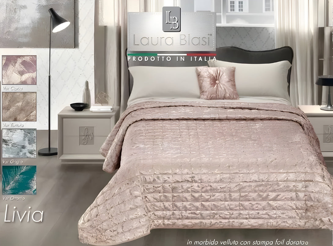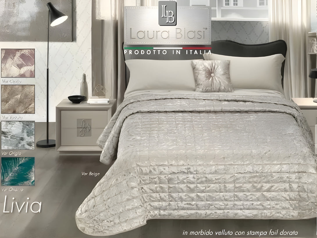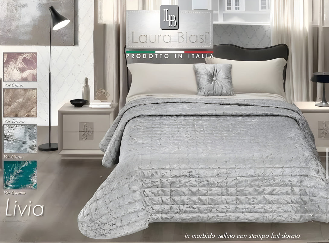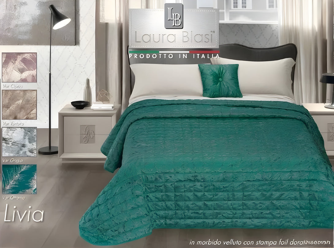 Il Trapuntino Livia è un complemento d’arredo sofisticato, ideale per arricchire la camera da letto con un tocco di eleganza. Realizzato in velluto jacquard, si distingue per la sua texture morbida e l’effetto visivo dinamico, esaltato dalla stampa laminata con motivo foliage che crea riflessi luminosi sulla superficie.