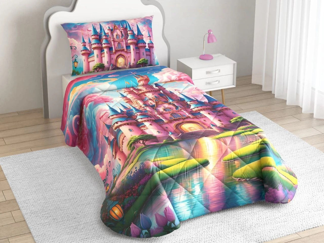 Porta la magia di un mondo incantato direttamente nella cameretta con il trapuntino Castello. La suggestiva stampa digitale raffigura un maestoso castello immerso in un paesaggio fiabesco, perfetto per alimentare i sogni e la fantasia dei più piccoli.