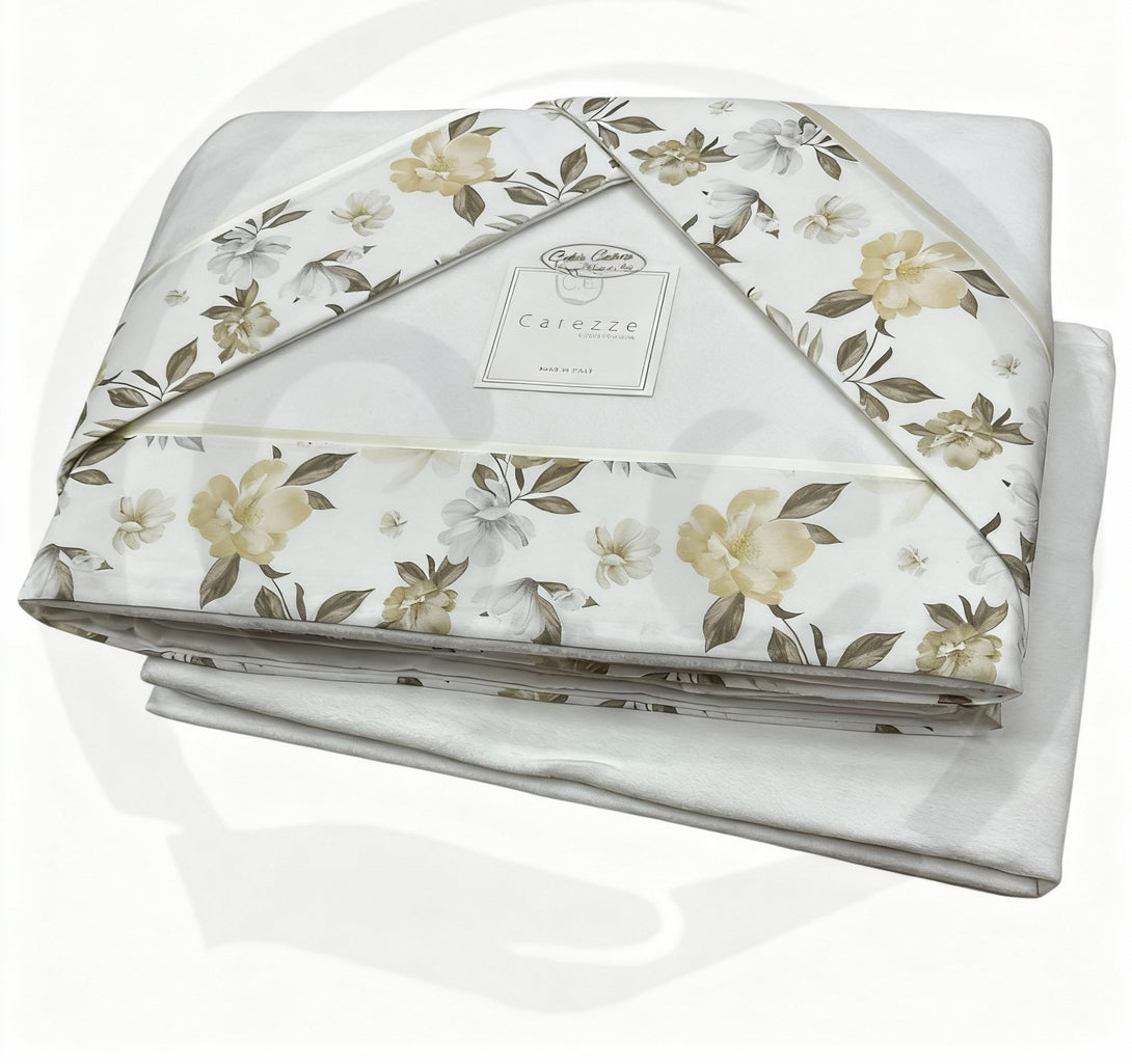 Il Completo Lenzuola Fiordaliso unisce la purezza della tinta unita alla ricercatezza di una fascia digitale ad alta definizione, che dona carattere e raffinatezza al letto con un dettaglio elegante e contemporaneo.
