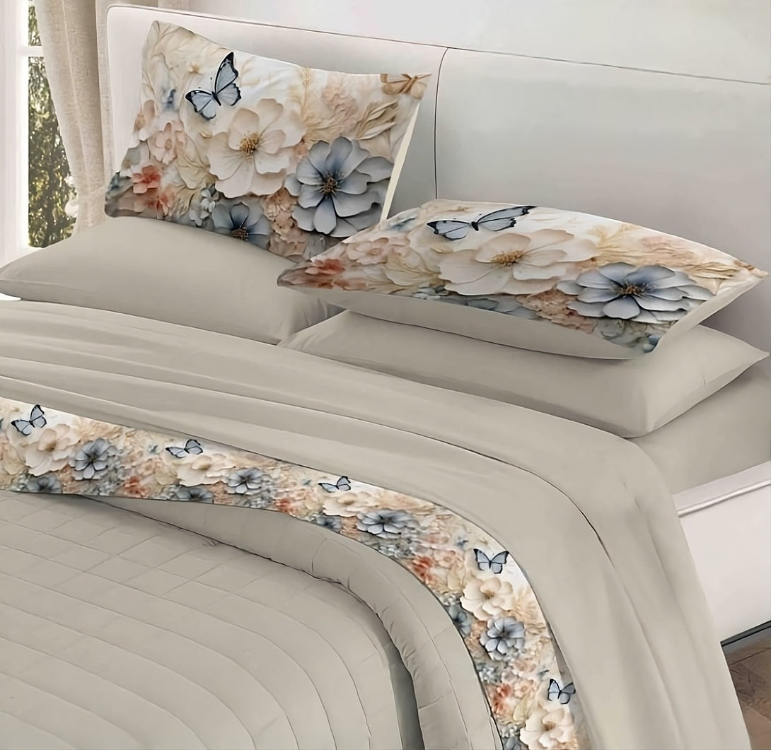 Rendi la tua camera da letto un’oasi di eleganza e armonia con il Completo Lenzuola Mariposa, realizzato in morbido cotone e impreziosito da balza e federe in stampa digitale 3D.