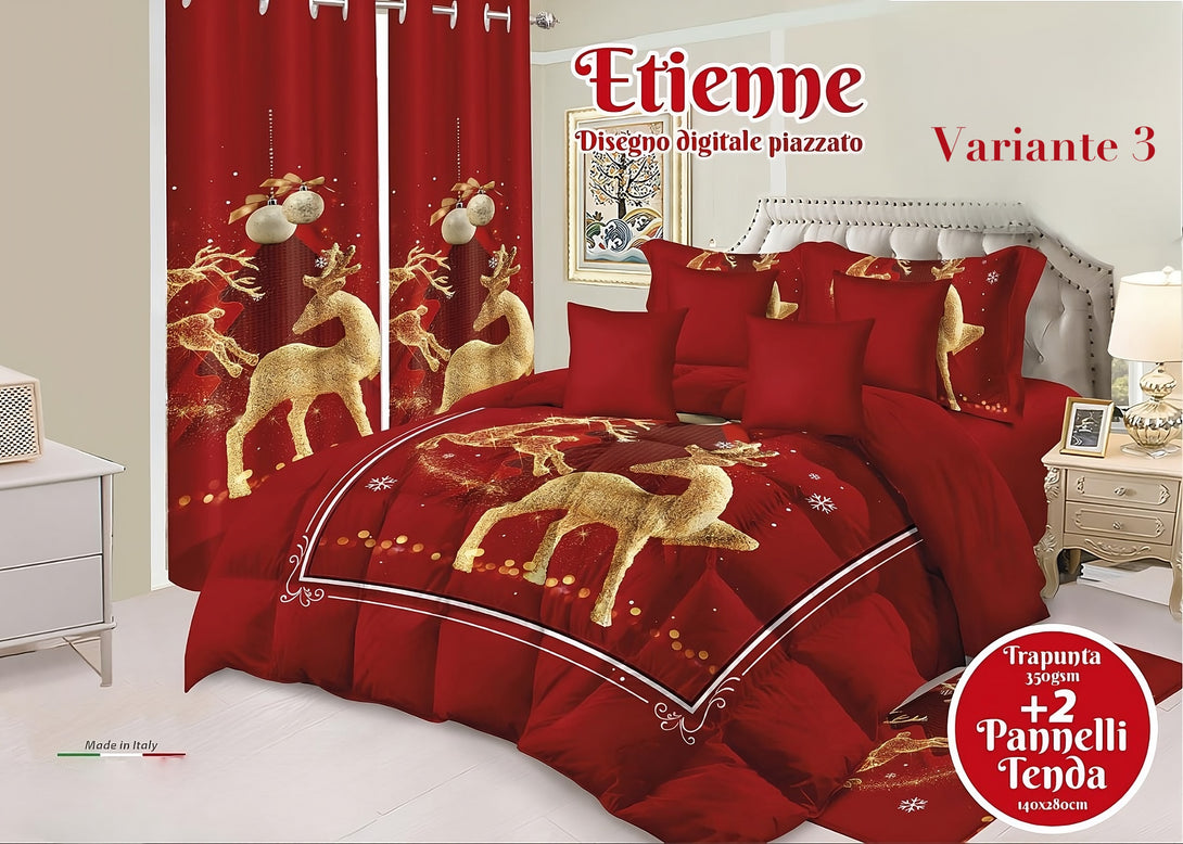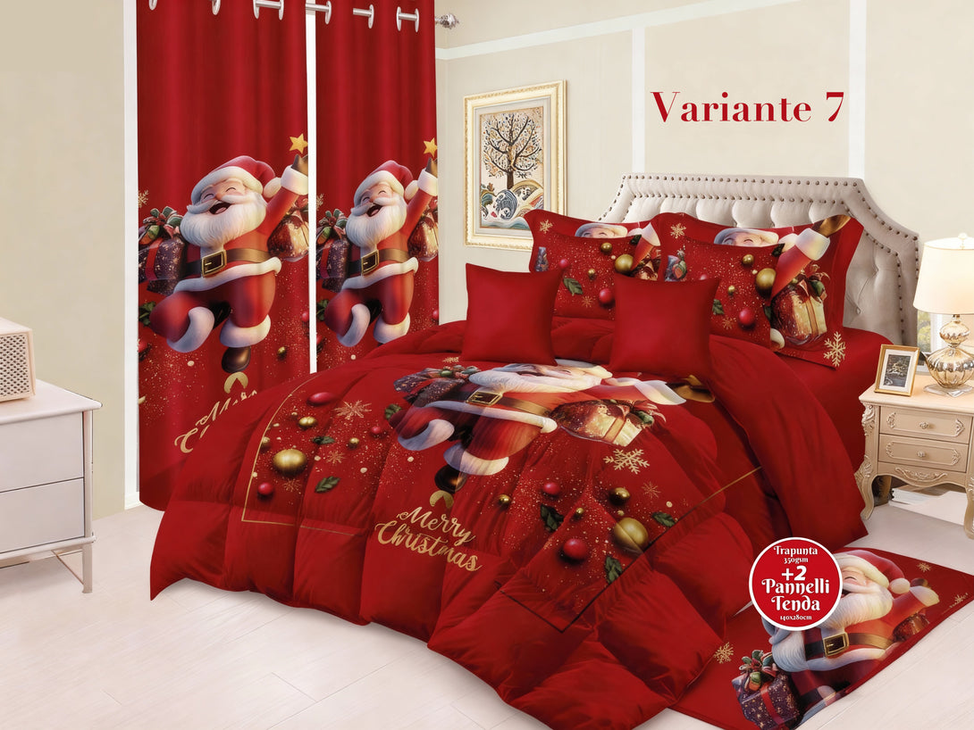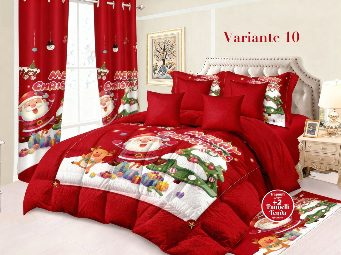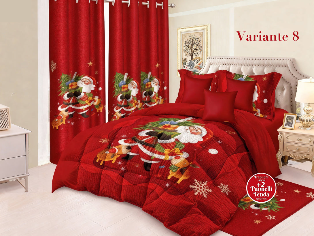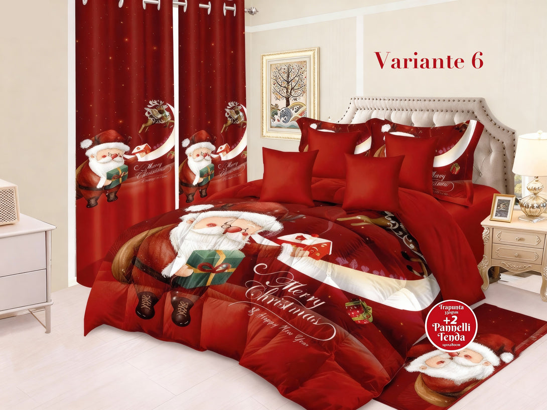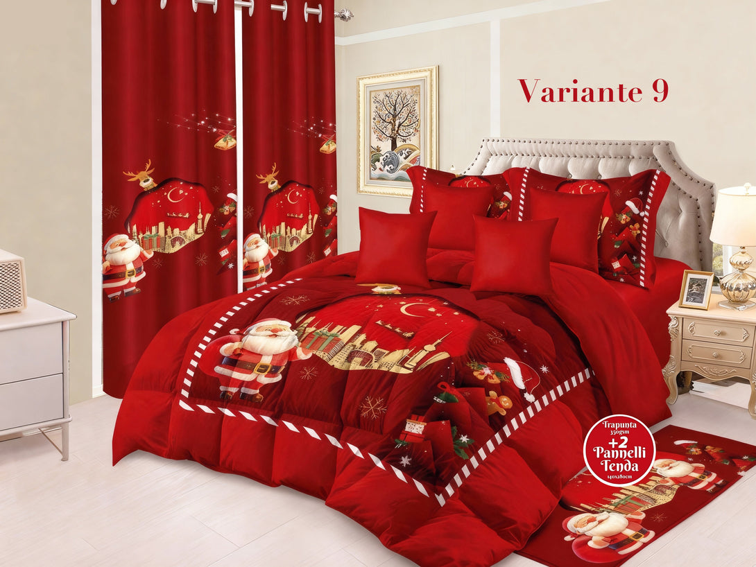 Il coordinato comprende anche due pannelli tenda abbinati, perfetti per completare con stile l’arredo e rendere la stanza ancora più suggestiva durante le feste.