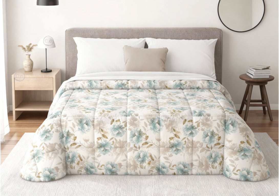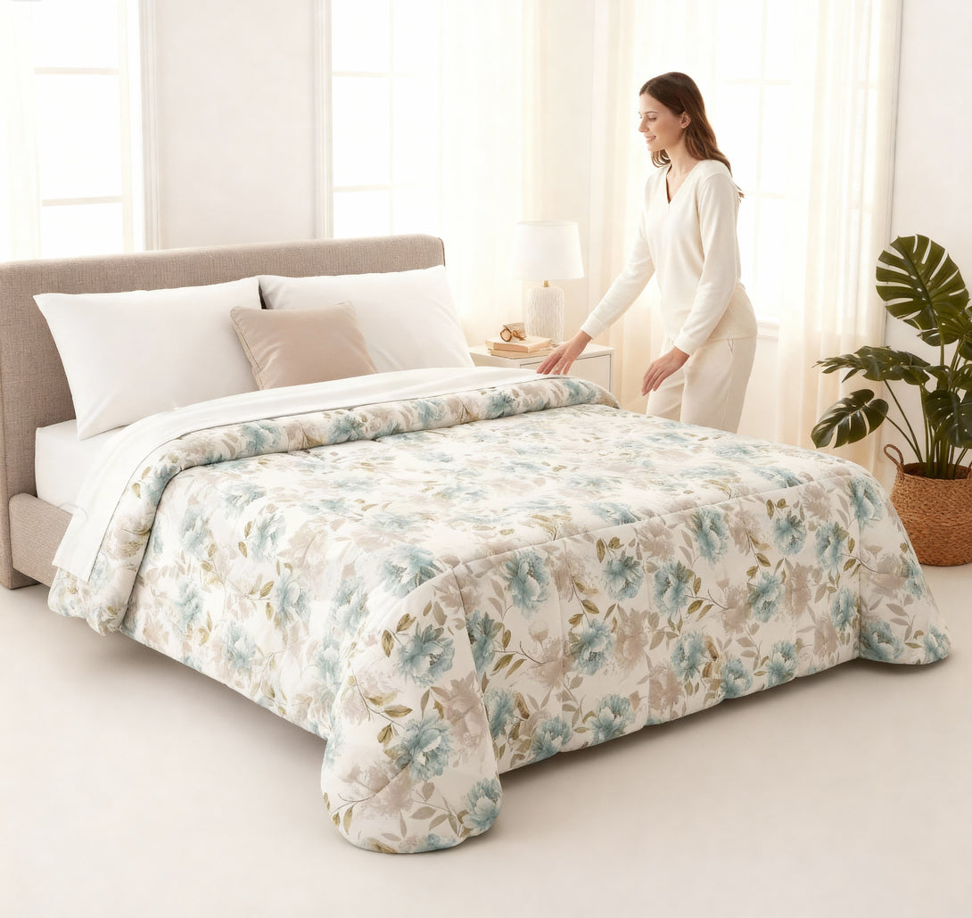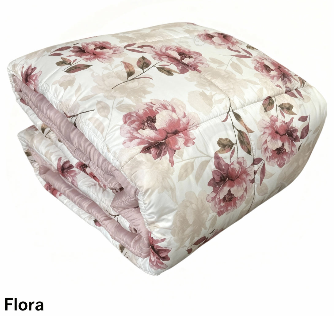 Avvolgiti nel comfort e nella bellezza con la Trapunta Flora, un’elegante scelta double-face che unisce una raffinata fantasia floreale al fascino essenziale del lato tinta unita. Realizzata in microfibra anallergica a tocco mano pesca, regala una sensazione di estrema morbidezza e calore, ideale per accompagnarti nelle notti più fredde.