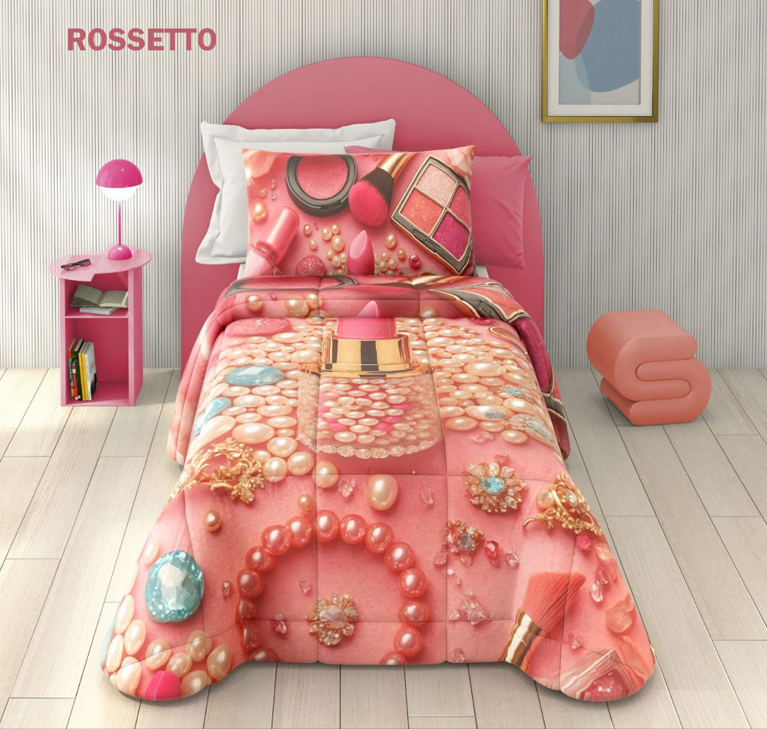 La semplicità in camera da letto è sempre un punto a favore soprattutto quando si tratta di un ambiente pensato per i più piccoli. Con un design ispirato al mondo del make-up, questa trapunta è una celebrazione dei colori e della femminilità. Realizzata per letti singoli, è la scelta ideale per le giovani appassionate di bellezza. In morbida microfibra, questo capo è caldo ed ideale per il periodo invernale.